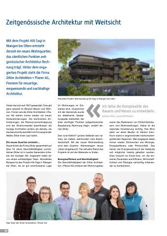 Mit dem Projekt Alti Sagi in Wangen bei Olten entsteht derzeit ein neues Wohnquartier, das sämtlichen Punkten zeit- genössischer Architektur Rech- nung trägt. Hinter dem enga- gierten Projekt steht die Firma Zihler Architekten + Planer AG, Pioniere für neuartige, wegweisende und nachhaltige Architektur.