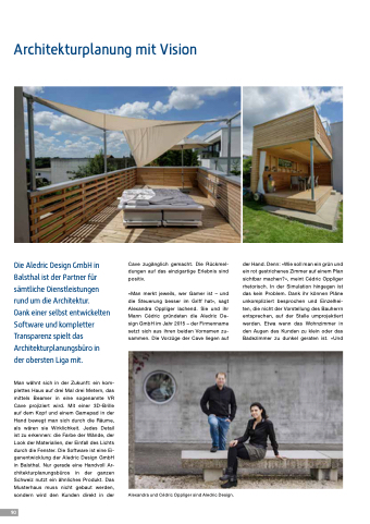 Man wähnt sich in der Zukunft: ein kom- plettes Haus auf drei Mal drei Metern, das mittels Beamer in eine sogenannte VR Cave projiziert wird. Mit einer 3D-Brille auf dem Kopf und einem Gamepad in der Hand bewegt man sich durch die Räume, als wären sie Wirklichkeit. Jedes Detail ist zu erkennen: die Farbe der Wände, der Look der Materialien, der Einfall des Lichts durch die Fenster. Die Software ist eine Ei- genentwicklung der Aledric Design GmbH in Balsthal. Nur gerade eine Handvoll Ar- chitekturplanungsbüros in der ganzen Schweiz nutzt ein ähnliches Produkt. Das Musterhaus muss nicht gebaut werden, sondern wird den Kunden direkt in der