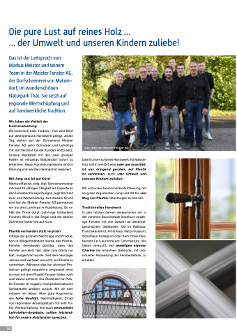 Das ist der Leitspruch von Markus Meister und seinem Team in der Meister Fenster AG, der Dorfschreinerei von Matzen- dorf, im wunderschönen Naturpark Thal. Sie setzt auf regionale Wertschöpfung und auf handwerkliche Tradition.
