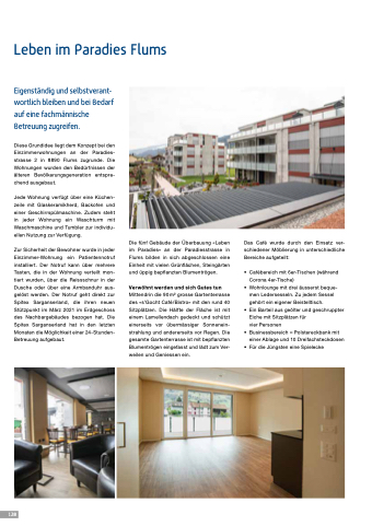 Diese Grundidee liegt dem Konzept bei den Einzimmerwohnungen an der Paradies- strasse 2 in 8890 Flums zugrunde. Die Wohnungen wurden den Bedürfnissen der älteren Bevölkerungsgeneration entspre- chend ausgebaut.
