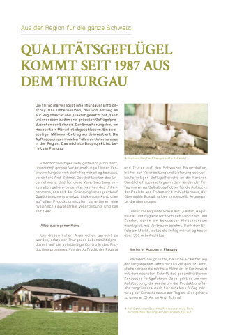 Die frifag märwil ag ist eine Thurgauer Erfolgs story. Das Unternehmen, das von Anfang an auf Regionalität und Qualität gesetzt hat, zählt unterdessen zu den drei grössten Geflügelpro duzenten der Schweiz. Der Erweiterungsbau am Hauptsitz in Märwil ist abgeschlossen. Ein zwei stelliger MillionenBetrag wurde investiert. Die Aufträge gingen in vielen Fällen an Unternehmen in der Region. Das nächste Bauprojekt ist be reits in Planung.
