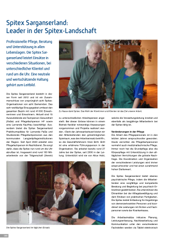 Die Spitex Sarganserland besteht in die- ser Form seit 2012 und ist ein Zusam- menschluss von ursprünglich acht Spitex- Organisationen von acht Gemeinden. Das sehr weitläufige Einzugsgebiet umfasst den gesamten Bezirk mit rund 41 000 Einwoh- nerinnen und Einwohnern. Aktuell sind 15 Auszubildende als Fachperson Gesundheit (FaGe) und Pflegefachperson HF sowie eine Lernende Kauffrau beschäftigt. Aus- serdem bietet die Spitex Sarganserland Praktikumsplätze für Lernende FaGe und Studierende Pflegefachpersonen aus den kommunalen Langzeitpflegeinstitutionen der Region. Seit April 2020 arbeitet eine Pflegefachperson im Nachtdienst. Sie sorgt dafür, dass die Spitex nun rund um die Uhr abrufbar ist. Insgesamt sind rund 160 Mit- arbeitende von der Trägerschaft (Verein)