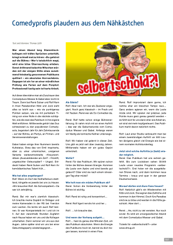 René: Das Publikum hat uns extrem ge- fehlt. Bis zum Lockdown sahen 35 000 Leute unser neustes Programm «selber- tschold?!». Erst holen wir die ausgefalle- nen Shows nach, und dann kommen neue Termine – kreuz und quer in der ganzen Deutschschweiz.