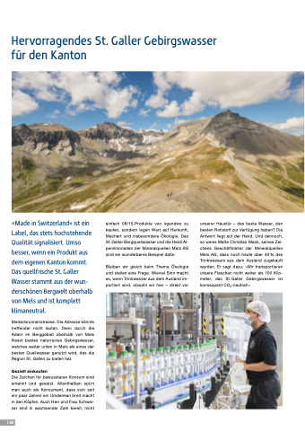 einfach 08/15-Produkte von irgendwo zu kaufen, sondern legen Wert auf Herkunft, Machart und insbesondere Ökologie. Das St. Galler Bergquellwasser und die Heidi Al- penlimonaden der Mineralquellen Mels AG sind ein wunderbares Beispiel dafür.