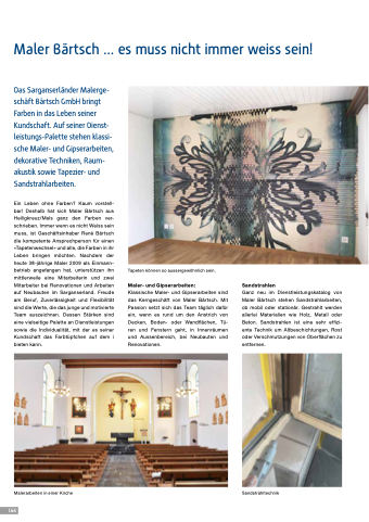 Das Sarganserländer Malerge- schäft Bärtsch GmbH bringt Farben in das Leben seiner Kundschaft. Auf seiner Dienst- leistungs-Palette stehen klassi- sche Maler- und Gipserarbeiten, dekorative Techniken, Raum- akustik sowie Tapezier- und Sandstrahlarbeiten.