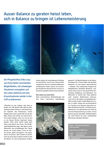 gemacht. Die Räumlichkeiten an der Bahn- hofstrasse 40 in Flums bieten das perfekte Ambiente, um sich besser wahrzunehmen – «sibewa». Das umfassende Angebot der Pflegefachfrau beinhaltet Beratung, Coa- ching sowie Kurse für die persönliche Ent- wicklung, Begleitung und Motivation von Menschen in unserer Zeit. Dazu gehören unter anderen Medizinische Hypnose, Time-out für die Seele und Gerätetauchen. Wenn es darum geht, wieder Balance im Le- ben zu finden, bietet sich die Kombination von Tauchen und Hypnose besonders an. Was der Mensch braucht, um Stress auszu- balancieren und Lebenskrisen als Chancen für einen Neuausrichtung zu nutzen, ist laut Erika Loop sehr individuell. Deshalb beginnt der erste Schritt mit einer umfassenden Klärung der aktuellen Situation.