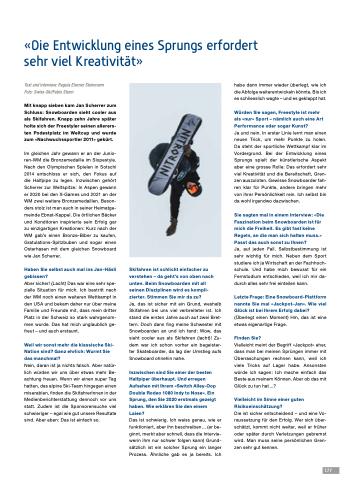 Im gleichen Jahr gewann er an der Junio- ren-WM die Bronzemedaille im Slopestyle. Nach den Olympischen Spielen in Sotschi 2014 entschloss er sich, den Fokus auf die Halfpipe zu legen. Inzwischen gehört Scherrer zur Weltspitze: In Aspen gewann er 2020 bei den X-Games und 2021 an der WM zwei weitere Bronzemedaillen. Beson- ders stolz ist man auch in seiner Heimatge- meinde Ebnat-Kappel. Die örtlichen Bäcker und Konditoren inspirierte sein Erfolg gar zu einzigartigen Kreationen: Kurz nach der WM gab’s einen Bronze-Biber zu kaufen, Gratulations-Spitzbuben und sogar einen Osterhasen mit dem gleichen Snowboard wie Jan Scherrer.