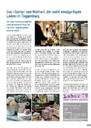 «Das ist ja wie in SoHo hier!!!», hat letztens eine Kundin zu mir gesagt. Sie konnte sich kaum mehr erholen, so begeistert war sie von unserem über 250 m2 grossen Geschäft in Wattwil.» Das erzählt mir Béa Weber, die Inhaberin dieses wohl aussergewöhnlichs- ten Stores in der Ostschweiz. «Niemals hätte ich gedacht, einmal mit SoHo, diesem kreativen, verrückten und trendigen Stadt- viertel New Yorks, verglichen zu werden.» Es hat aber tatsächlich einen internationa- len Groove, dieses Labor 79 mit all den hun- derten verschieden Brands, die Béa Weber auf der ganzen Welt sucht – und vor allem auch findet! Sie ist der kreative Kopf und das Herz des Labors und ist den Trends im- mer einen Schritt voraus.