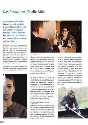 So vielseitig wie der 35-Jährige, der 40-Jährige und der 57-Jährige, die hier gemeinsame Sache machen, ist auch das Konzept des Restaurants Thurpark. In Wattwil gibt es nichts Vergleichbares. Sei es ein Geschäftsessen, ein gemütlicher Fa- milienzmorge oder ein Candlelight-Dinner in gediegenem Ambiente: Das ist im Thur- park alles möglich. Dank separater Berei- che im Restaurant finden sich Familien und «Büezer» genauso wie Geschäftsleute und Gourmets immer in stimmiger Umgebung. Hier fühlt sich jede und jeder wohl.