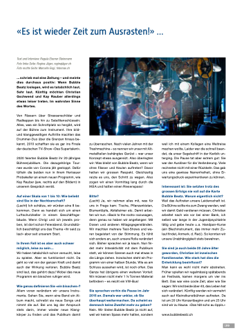 Interessant ist: Sie setzten trotz des grossen Erfolgs nie voll auf die Karte Bubble Beatz. Warum eigentlich nicht? Weil das Auftreten unsere Leidenschaft ist. Die Bühne sollte nie zum Zwang werden, weil wir damit Geld verdienen müssen. Christian arbeitet nach wie vor bei einer Bank, ich selbst war lange in der Jugendpsychiatrie tätig und gebe heute u. a. Handpan-Kurse (ein Blechinstrument, das immer mehr Zu- lauf findet, Anmerk. d. Red.). So konnten wir unsere Unabhängigkeit stets bewahren.