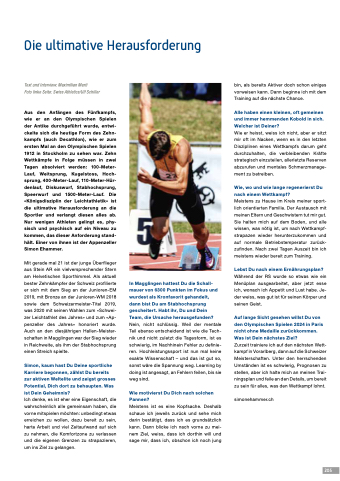 Aus den Anfängen des Fünfkampfs, wie er an den Olympischen Spielen der Antike durchgeführt wurde, entwi- ckelte sich die heutige Form des Zehn- kampfs (auch Decathlon), wie er zum ersten Mal an den Olympischen Spielen 1912 in Stockholm zu sehen war. Zehn Wettkämpfe in Folge müssen in zwei Tagen absolviert werden: 100-Meter- Lauf, Weitsprung, Kugelstoss, Hoch- sprung, 400-Meter-Lauf, 110-Meter-Hür- denlauf, Diskuswurf, Stabhochsprung, Speerwurf und 1500-Meter-Lauf. Die «Königsdisziplin der Leichtathletik» ist die ultimative Herausforderung an die Sportler und verlangt diesen alles ab. Nur wenigen Athleten gelingt es, phy- sisch und psychisch auf ein Niveau zu kommen, das dieser Anforderung stand- hält. Einer von ihnen ist der Appenzeller Simon Ehammer.