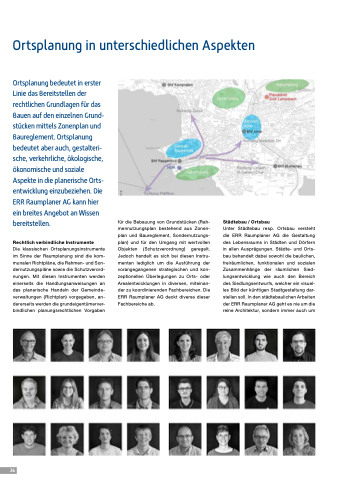 für die Bebauung von Grundstücken (Rah- mennutzungsplan bestehend aus Zonen- plan und Baureglement, Sondernutzungs- plan) und für den Umgang mit wertvollen Objekten (Schutzverordnung) geregelt. Jedoch handelt es sich bei diesen Instru- menten lediglich um die Ausführung der vorangegangenen strategischen und kon- zeptionellen Überlegungen zu Orts- oder Arealentwicklungen in diversen, miteinan- der zu koordinierenden Fachbereichen. Die ERR Raumplaner AG deckt diverse dieser Fachbereiche ab.