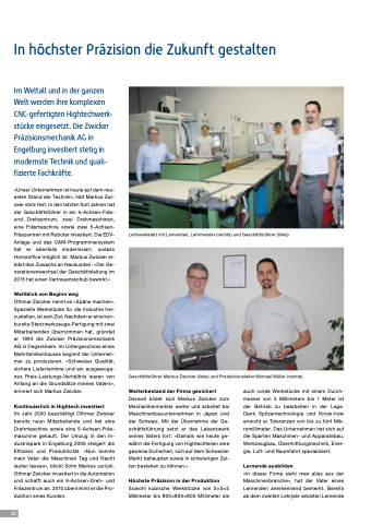 Im Weltall und in der ganzen Welt werden ihre komplexen CNC-gefertigten Hightechwerk- stücke eingesetzt. Die Zwicker Präzisionsmechanik AG in Engelburg investiert stetig in modernste Technik und quali- fizierte Fachkräfte.