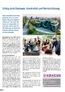 Das Unternehmen, das bereits über 550 Mitarbeitende zählt, setzt seit seinen An- fängen auf eine Unternehmenskultur, die auf Freiraum, Kreativität und Teamwork basiert. So gilt seit jeher das Bestreben, Mitarbeitenden die Möglichkeit zu bieten, sich in ihren Aufgabengebieten optimal zu entfalten und das Beste aus sich herauszu- holen. Und wie die Geschichte von Abacus zeigt: Wenn Mitarbeitende ihre Stärken und Ideen zusammenbringen, dann entsteht langfristiger Mehrwert – für Mitarbeitende, Unternehmen, Partner und Kunden.