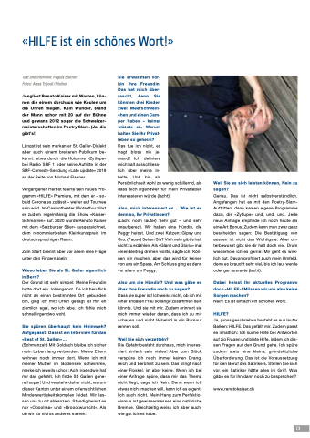 Vergangenen Herbst feierte sein neues Pro- gramm «HILFE» Premiere, mit dem er – so- bald Corona es zulässt – weiter auf Tournee sein wird. Im Casinotheater Winterthur führt er zudem regelmässig die Show «Kaiser- Schmarren» auf. 2020 wurde Renato Kaiser mit dem «Salzburger Stier» ausgezeichnet, dem renommiertesten Kleinkunstpreis im deutschsprachigen Raum.