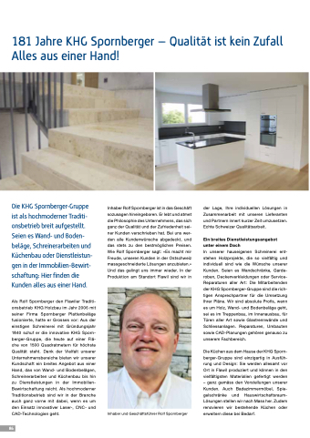 Die KHG Spornberger-Gruppe ist als hochmoderner Traditi- onsbetrieb breit aufgestellt. Seien es Wand- und Boden- beläge, Schreinerarbeiten und Küchenbau oder Dienstleistun- gen in der Immobilien-Bewirt- schaftung: Hier finden die Kunden alles aus einer Hand.