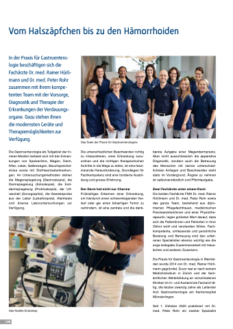 In der Praxis für Gastroentero- logie beschäftigen sich die Fachärzte Dr. med. Rainer Hürli- mann und Dr. med. Peter Rohr zusammen mit ihrem kompe- tenten Team mit der Vorsorge, Diagnostik und Therapie der Erkrankungen der Verdauungs- organe. Dazu stehen ihnen
