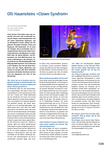 Unter diesem Titel haben zwei eng ver- wandte und doch weit voneinander ge- trennte Seelen zusammengefunden und mit einem Experiment begonnen, das zur Erfolgsstory wurde. Initiant war der gelernte Thurgauer Komiker, Clown und Regisseur Olli Hauenstein. Er ist einer der wenigen, die es verstanden, den un- vergleichlichen Charme der frühen Com- media dell’arte in die Moderne zu retten. Nach über 30 Jahren Bühnen- und Zir- kusarbeit und Solo-Welt-Tourneen lan- cierte er Workshops in der Schweiz, un- ter anderem zur Theaterpädagogik in der Bildungsstätte Sommeri. Dort entdeckte er Eric Gadient. Eric hat das Down-Syn- drom und das Talent, Menschen zum Lachen zu bringen. Mit ihren Auftritten bereichern die beiden die Szene auf eine noch nie dagewesen Art. Hier ist ihre Geschichte: