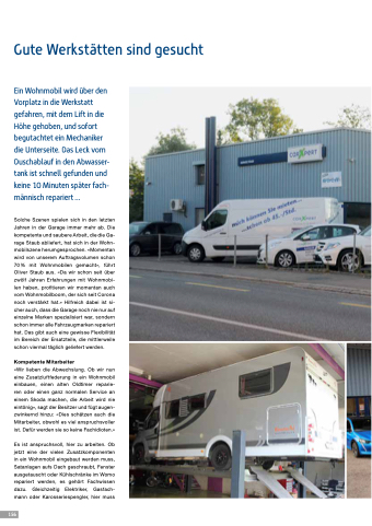 Ein Wohnmobil wird über den Vorplatz in die Werkstatt gefahren, mit dem Lift in die Höhe gehoben, und sofort begutachtet ein Mechaniker die Unterseite. Das Leck vom Duschablauf in den Abwasser- tank ist schnell gefunden und keine 10 Minuten später fach- männisch repariert ...