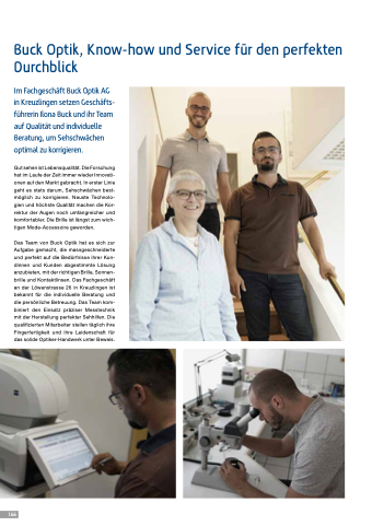 Das Team von Buck Optik hat es sich zur Aufgabe gemacht, die massgeschneiderte und perfekt auf die Bedürfnisse ihrer Kun- dinnen und Kunden abgestimmte Lösung anzubieten, mit der richtigen Brille, Sonnen- brille und Kontaktlinsen. Das Fachgeschäft an der Löwenstrasse 26 in Kreuzlingen ist bekannt für die individuelle Beratung und die persönliche Betreuung. Das Team kom- biniert den Einsatz präziser Messtechnik mit der Herstellung perfekter Sehhilfen. Die qualifizierten Mitarbeiter stellen täglich ihre Fingerfertigkeit und ihre Leidenschaft für das solide Optiker-Handwerk unter Beweis.