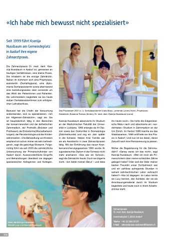 Die Zahnarztpraxis Dr. med. dent. Kse- nija Nussbaum in Aadorf ist, gemessen an heutigen Verhältnissen, eine kleine Praxis. Die Inhaberin ist die einzige Zahnärztin. Neben ihr kümmern sich eine Prophylaxe- assistentin (Dentalhygiene), eine diplo- mierte Dentalassistentin sowie alternierend eine beziehungsweise zwei Lernende um das Wohl der Patientinnen und Patienten. Als Lehrmeisterin begleitete sie bis heute sieben Dentalassistentinnen zum erfolgrei- chen Lehrabschluss.