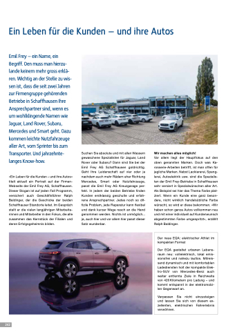 Emil Frey – ein Name, ein Begriff. Den muss man hierzu- lande keinem mehr gross erklä- ren. Wichtig an der Stelle zu wis- sen ist, dass die seit zwei Jahren zur Firmengruppe gehörenden Betriebe in Schaffhausen Ihre Ansprechpartner sind, wenn es um wohlklingende Namen wie Jaguar, Land Rover, Subaru, Mercedes und Smart geht. Dazu kommen leichte Nutzfahrzeuge aller Art, vom Sprinter bis zum Transporter. Und jahrzehnte- langes Know-how.