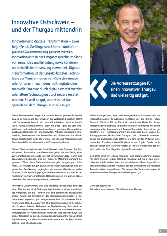 Innovation und digitale Transformation – zwei Begriffe, die Zwillinge sein könnten und oft im gleichen Zusammenhang genannt werden. Innovation wird in der Umgangssprache im Sinne von neuer Idee und Erfindung sowie für deren wirtschaftliche Umsetzung verwendet. Digitale Transformation ist der Einsatz digitaler Techno- logie zur Transformation von Dienstleistungen oder Unternehmen, indem nicht-digitale oder manuelle Prozesse durch digitale ersetzt werden oder ältere Technologien durch neuere ersetzt werden. So weit so gut, aber was hat das speziell mit dem Thurgau zu tun? Einiges.