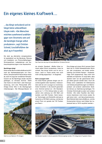 ... das klingt verlockend und ist längst keine unbezahlbare Utopie mehr. «Die Menschen möchten zunehmend unabhän- giger vom Stromnetz sein und die benötigte Energie selbst produzieren», sagt Christian Schmid, Geschäftsführer der alsol ag in Frauenfeld.
