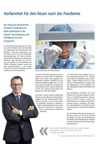 Dr. Sergej Kammerzell übernahm die Füh- rung der SIS Medical AG aus Frauenfeld vom Mitgründer des Unternehmens, Willi Zwahlen, im Mai des vergangenen Jah- res. 2020 wurde ein Jahr der besonderen Herausforderungen. Ein Teil des Medizin- technik-Marktes boomte zwar während der Pandemie. Viele Hersteller, die nicht Ge- räte und Zubehör für die Behandlung der COVID-19-Patienten anboten, sahen sich aber, pandemiebedingt, in den letzten 12 Monaten mit einem Rückgang der Ge- schäfte um 20-30 % konfrontiert.