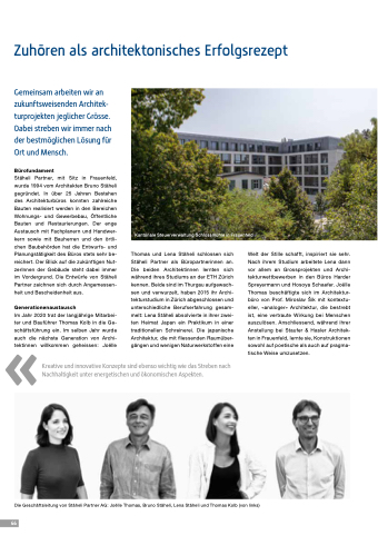 Stäheli Partner, mit Sitz in Frauenfeld, wurde 1994 vom Architekten Bruno Stäheli gegründet. In über 25 Jahren Bestehen des Architekturbüros konnten zahlreiche Bauten realisiert werden in den Bereichen Wohnungs- und Gewerbebau, Öffentliche Bauten und Restaurierungen. Der enge Austausch mit Fachplanern und Handwer- kern sowie mit Bauherren und den örtli- chen Baubehörden hat die Entwurfs- und Planungstätigkeit des Büros stets sehr be- reichert. Der Blick auf die zukünftigen Nut- zerInnen der Gebäude steht dabei immer im Vordergrund. Die Entwürfe von Stäheli Partner zeichnen sich durch Angemessen- heit und Bescheidenheit aus.