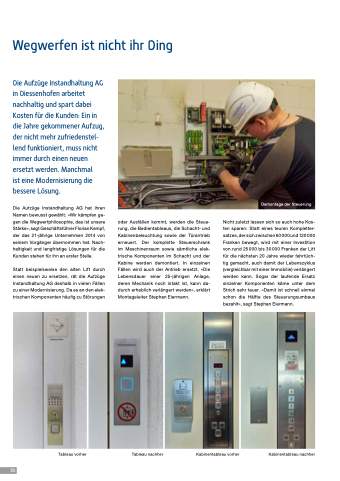 Die Aufzüge Instandhaltung AG in Diessenhofen arbeitet nachhaltig und spart dabei Kosten für die Kunden: Ein in die Jahre gekommener Aufzug, der nicht mehr zufriedenstel- lend funktioniert, muss nicht immer durch einen neuen ersetzt werden. Manchmal