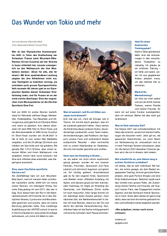 Seit sie 2009 ihr erstes Rennen bestritt, weist ihr Palmarès zahllose Siege, Meister- titel, Podestplätze, Top-Resultate und Eh- rungen aus, jetzt gekrönt von Olympia-Silber und, kaum zu glauben, kurz darauf oben- drein mit dem WM-Titel im Short-Track und der Bronzemedaille im WM-Cross Country! Im Short-Track wurden am 26.08.2021 in Val di Sole (I) zum ersten Mal Medaillen vergeben, und die 24-jährige Zürcherin aus Uetikon am See holte sich die goldene. Mit gerade Mal 1,51m Grösse, aber einem ei- sernen Willen und ihrem Wahlspruch «nie aufgeben, immer nach vorne schauen» hat Sina sich offenbar alles erarbeitet, was Sie- gertypen ausmacht.