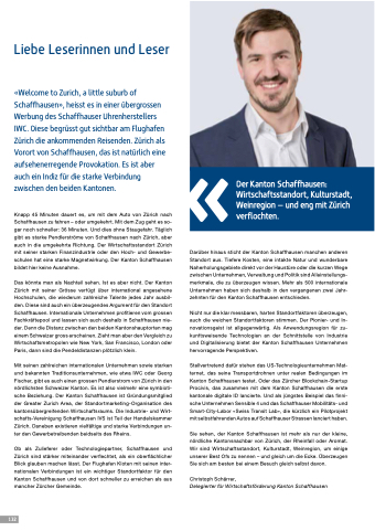 Mit seinen zahlreichen internationalen Unternehmen sowie starken und bekannten Traditionsunternehmen, wie etwa IWC oder Georg Fischer, gibt es auch einen grossen Pendlerstrom von Zürich in den nördlichsten Schweizer Kanton. Es ist also vielmehr eine symbioti- sche Beziehung. Der Kanton Schaffhausen ist Gründungsmitglied der Greater Zurich Area, der Standortmarketing-Organisation des kantonsübergreifenden Wirtschaftsraums. Die Industrie- und Wirt- schafts-Vereinigung Schaffhausen IVS ist Teil der Handelskammer Zürich. Daneben existieren vielfältige und starke Verbindungen un- ter den Gewerbetreibenden beidseits des Rheins.