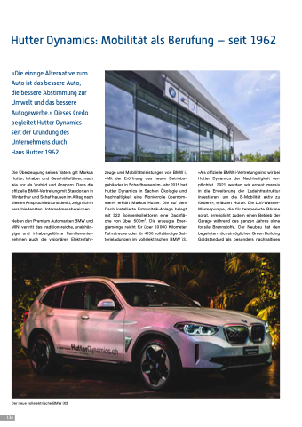 zeuge und Mobilitätsleistungen von BMW i. «Mit der Eröffnung des neuen Betriebs- gebäudes in Schaffhausen im Jahr 2015 hat Hutter Dynamics in Sachen Ökologie und Nachhaltigkeit eine Pionierrolle übernom- men», erklärt Markus Hutter. Die auf dem Dach installierte Fotovoltaik-Anlage belegt mit 322 Sonnenkollektoren eine Dachflä- che von über 500m2. Die erzeugte Ener- giemenge reicht für über 60 000 Kilometer Fahrstrecke oder für 4130 vollständige Bat- terieladungen im vollelektrischen BMW i3.