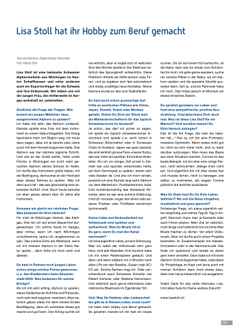 Lisa Stoll ist eine bekannte Schweizer Alphornsolistin aus Wilchingen im Kan- ton Schaffhausen und unter anderem auch ein Exportschlager für die Schweiz und ihre Volksmusik. Wir haben uns mit der jungen Frau, die mittlerweile im Aar- gau wohnhaft ist, unterhalten.