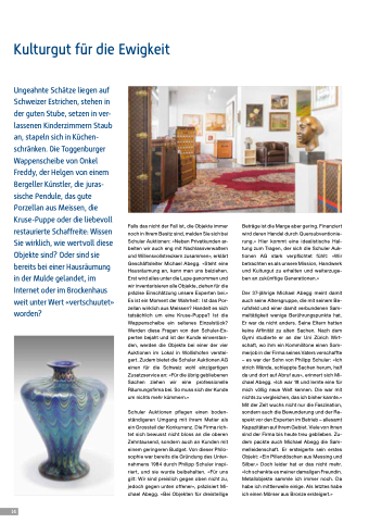 Ungeahnte Schätze liegen auf Schweizer Estrichen, stehen in der guten Stube, setzen in ver- lassenen Kinderzimmern Staub an, stapeln sich in Küchen- schränken. Die Toggenburger Wappenscheibe von Onkel Freddy, der Helgen von einem Bergeller Künstler, die juras- sische Pendule, das gute Porzellan aus Meissen, die Kruse-Puppe oder die liebevoll restaurierte Schaffreite: Wissen Sie wirklich, wie wertvoll diese Objekte sind? Oder sind sie bereits bei einer Hausräumung in der Mulde gelandet, im Internet oder im Brockenhaus weit unter Wert «vertschuutet» worden?