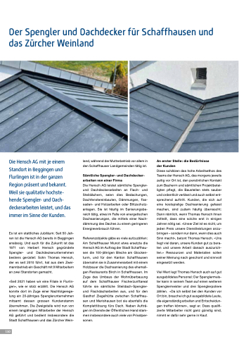 Die Hensch AG mit je einem Standort in Beggingen und Flurlingen ist in der ganzen Region präsent und bekannt. Weil sie qualitativ hochste- hende Spengler- und Dach- deckerarbeiten leistet, und das immer im Sinne der Kunden.