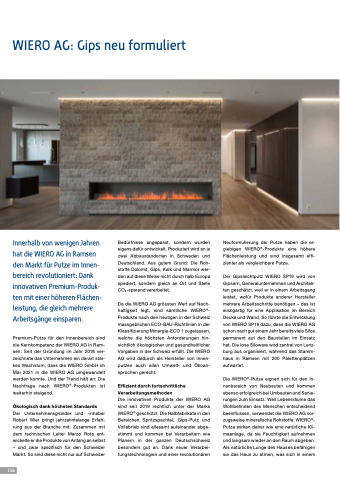 Premium-Putze für den Innenbereich sind die Kernkompetenz der WIERO AG in Ram- sen: Seit der Gründung im Jahr 2018 ver- zeichnete das Unternehmen ein derart star- kes Wachstum, dass die WIERO GmbH im Mai 2021 in die WIERO AG umgewandelt werden konnte. Und der Trend hält an: Die Nachfrage nach WIERO®-Produkten ist weiterhin steigend.