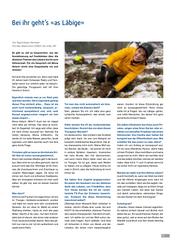 Es gibt so viel zu besprechen: von der Sozialisierung auf Festbänken über die düsteren Themen des Lebens bis hin zum Hühnerstall. Für ein Gespräch mit Mona Vetsch reicht eine Doppelseite nie und nimmer!