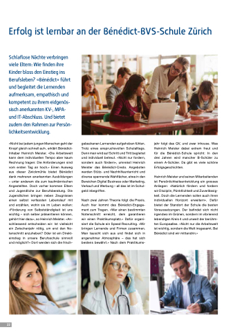 Schlaflose Nächte verbringen viele Eltern: Wie finden ihre Kinder bloss den Einstieg ins Berufsleben? «Bénédict» führt und begleitet die Lernenden aufmerksam, empathisch und kompetent zu ihrem eidgenös- sisch anerkannten KV-, MPA- und IT-Abschluss. Und bietet zudem den Rahmen zur Persön- lichkeitsentwicklung.