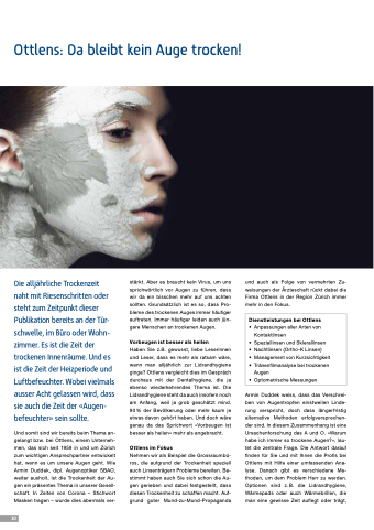 Und somit sind wir bereits beim Thema an- gelangt bzw. bei Ottlens, einem Unterneh- men, das sich seit 1959 in und um Zürich zum wichtigen Ansprechpartner entwickelt hat, wenn es um unsere Augen geht. Wie Armin Duddek, dipl. Augenoptiker SBAO, weiter ausholt, ist die Trockenheit der Au- gen ein präsentes Thema in unserer Gesell- schaft. In Zeiten von Corona – Stichwort Masken tragen – wurde dies abermals ver-