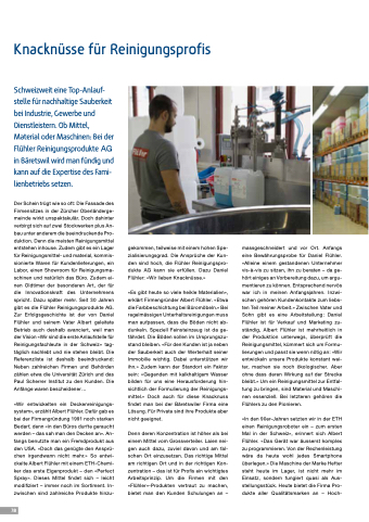 Schweizweit eine Top-Anlauf- stelle für nachhaltige Sauberkeit bei Industrie, Gewerbe und Dienstleistern. Ob Mittel, Material oder Maschinen: Bei der Flühler Reinigungsprodukte AG in Bäretswil wird man fündig und kann auf die Expertise des Fami- lienbetriebs setzen.