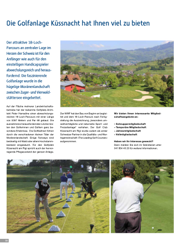 Auf der Fläche mehrerer Landwirtschafts- betriebe hat der bekannte Golfplatz-Archi- tekt Peter Harradine einen abwechslungs- reichen 18-Loch-Parcours mit einer Länge von 5397 Metern und Par 68 gebaut. Die ausnahmslos herausfordernden Löcher bie- ten den Golferinnen und Golfern ganz be- sondere Erlebnisse. Die Golfbahnen führen durch die verschiedenen kleinen Täler der Moränenlandschaft. Einige Fairways sind beidseitig mit Wald oder altem Hochstamm- bestand eingesäumt. Für den Golfplatz Küssnacht am Rigi spricht auch der hervor- ragende Pflegezustand der ganzen Anlage.