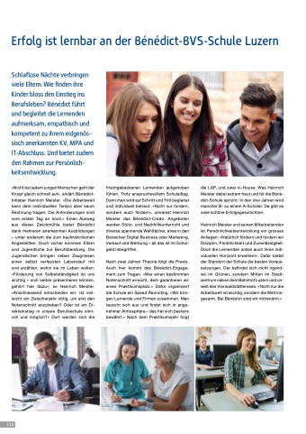 frischgebackenen Lernenden aufgehoben fühlen. Trotz anspruchsvollem Schulalltag. Denn man wird auf Schritt und Tritt begleitet und individuell betreut. «Nicht nur fordern, sondern auch fördern», umreisst Heinrich Meister das Bénédict-Credo. Angeboten werden Stütz- und Nachhilfeunterricht und diverse spannende Wahlfächer, etwa in den Bereichen Digital Business oder Marketing, Verkauf und Werbung – all das ist im Schul- geld inbegriffen.