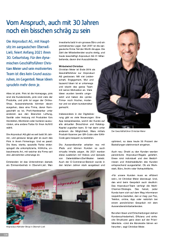 Die Airproduct AG, mit Haupt- sitz im aargauischen Oberwil- Lieli, feiert Anfang 2021 ihren 30. Geburtstag. Für den dyna- mischen Geschäftsführer Chris- tian Meier und sein motiviertes Team ist dies kein Grund auszu- ruhen, im Gegenteil: Neue Ideen sprudeln mehr denn je.