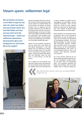 Was darf ich abziehen? Wie hole ich das Op- timum heraus? Solche Knacknüsse sorgen bei den meisten für schlaflose Nächte, bei Corinne Bircher, der Inhaberin von Bircher Treuhand, nicht. Im Gegenteil: Seit über 20 Jahren kümmert sie sich bei KMUs um Buchhaltung, Payroll, Steuern, IKS und Pro- zessoptimierungen. Sie tut das mit Talent, einem reich gefüllten beruflichen Rucksack und Leidenschaft. Davon profitieren auch zahlreiche Privatkunden: «Ich fülle unglaub- lich gern Steuererklärungen aus, liebe Zah- len und komplexe Herausforderungen.»