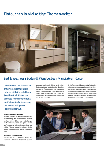 Die Marmobisa AG hat sich als dynamisches Familienunter- nehmen mit Leidenschaft den Bereichen Bad, Platten und Wellness verschrieben und ist der Partner für die Umsetzung von kleinen und grossen Projekten jeder Art.