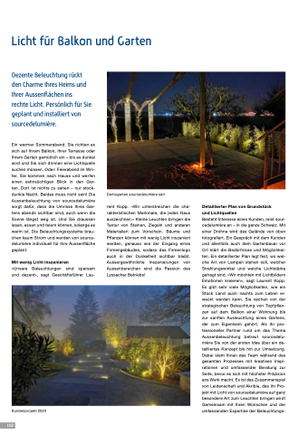 Besteht Interesse eines Kunden, reist sour- cedelumière an – in die ganze Schweiz. Mit einer Drohne wird das Gelände von oben fotografiert. Ein Gespräch mit dem Kunden und allenfalls auch dem Gartenbauer vor Ort klärt die Bedürfnisse und Möglichkei- ten. Ein detaillierter Plan legt fest, wo wel- che Art von Lampen stehen soll, welcher Strahlungswinkel und welche Lichtstärke gefragt sind. «Wir möchten mit Lichtbildern Emotionen kreieren», sagt Laurent Kopp. Es gibt sehr viele Möglichkeiten, wie ein Stück Land auch nachts zum Leben er- weckt werden kann. Sie reichen von der strategischen Beleuchtung von Topfpflan- zen auf dem Balkon einer Wohnung bis zur sanften Ausleuchtung eines Gartens, der zum Eigenheim gehört. Als Ihr pro- fessioneller Partner rund um das Thema Aussenbeleuchtung betreut sourcedelu- mière Sie von der ersten Idee über ein de- tailliertes Konzept bis hin zur Umsetzung. Dabei steht Ihnen das Team während des gesamten Prozesses mit kreativen Inspi- rationen und umfassender Beratung zur Seite, bevor es sich mit höchster Präzision ans Werk macht. Es ist das Zusammenspiel von Leidenschaft und Akribie, das Ihr Pro- jekt mit Licht von sourcedelumière auf ganz besondere Art zum Leuchten bringen wird! Gemeinsam mit Ihren Wünschen und der umfassenden Expertise der Beleuchtungs-