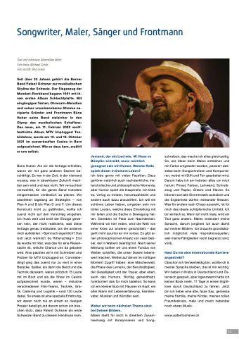 Büne Huber: Als wir die Anfrage erhielten, waren wir mit ganz anderen Sachen be- schäftigt. Es war in der Zeit, in der niemand wusste, was in absehbarer Zukunft mach- bar sein wird und was nicht. Wir versuchten verzweifelt, für die ganze Band trotzdem einigermassen verlässlich zu planen. Wir arbeiteten tagelang an Strategien – von PlanAundBbisPlanDundF.Umdieses Konstrukt nicht zu gefährden, wollte ich zuerst nicht auf den Vorschlag eingehen. Ich muss weit und breit der Einzige gewe- sen sein, der nicht realisierte, was diese Anfrage genau bedeutete, bis die anderen mich aufklärten: «Spinnsch eigentlich? Das isch jetzt würklich de Ritterschlag!» Erst da wurde mir klar, was das für eine Riesen- sache ist, welche Chance uns da geboten wird. Also packten wir’s mit Schreiben und Proben für MTV Unplugged an. Coronabe- dingt ging das zuerst nur zu viert in einer Baracke. Später, als dann die Band und die Technik dazukam, waren plötzlich 75 Leute mit im Boot und als die Show im Casino aufgezeichnet wurde, waren – inklusive verschiedenen Film-Teams, Technik, Gra- fik, Catering und Logistik – rund 120 Leute dabei. So etwas ist eine spezielle Erfahrung, wir waren noch nie an einem so riesigen Projekt beteiligt und darum schon ein biss- chen stolz, dass Patent Ochsner als erste Schweizer Band zu diesem Handkuss kam.