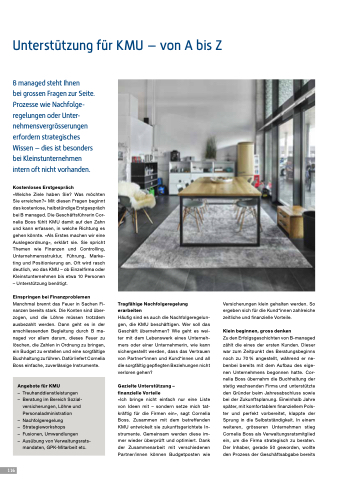 «Welche Ziele haben Sie? Was möchten Sie erreichen?» Mit diesen Fragen beginnt das kostenlose, halbstündige Erstgespräch bei B managed. Die Geschäftsführerin Cor- nelia Boss fühlt KMU damit auf den Zahn und kann erfassen, in welche Richtung es gehen könnte. «Als Erstes machen wir eine Auslegeordnung», erklärt sie. Sie spricht Themen wie Finanzen und Controlling, Unternehmensstruktur, Führung, Marke- ting und Positionierung an. Oft wird rasch deutlich, wo das KMU – ob Einzelfirma oder Kleinstunternehmen bis etwa 10 Personen – Unterstützung benötigt.